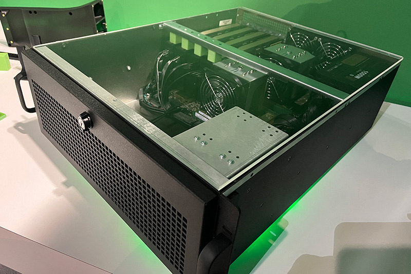 The display shows two sizes of our custom rack mount compute for image generation, 2U and 4U. The 4U is our custom USA made chassis in our efforts to support Buy American.