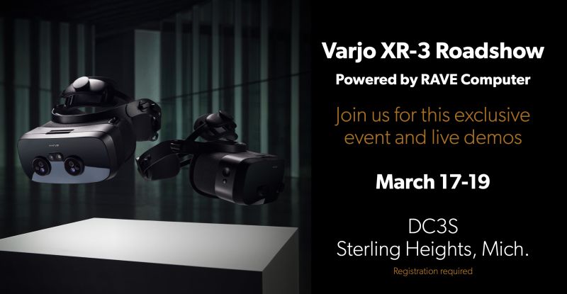 Varjo XR-3 roadshow powered by RAVE Computer We were at the Defense Corridor’s Center for Collaboration and Synergy in Sterling Heights, Michigan on March 15-18, 2021 for the Varjo XR-3 roadshow powered by RAVE Computer. Join us for a great opportunity to experience some of the first “sneak peak” live demonstrations of Varjo’s new XR-3